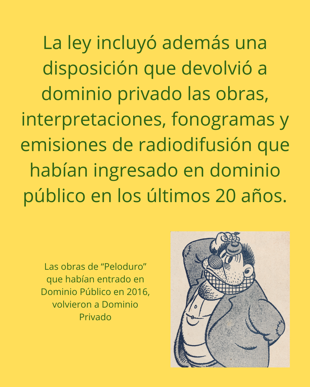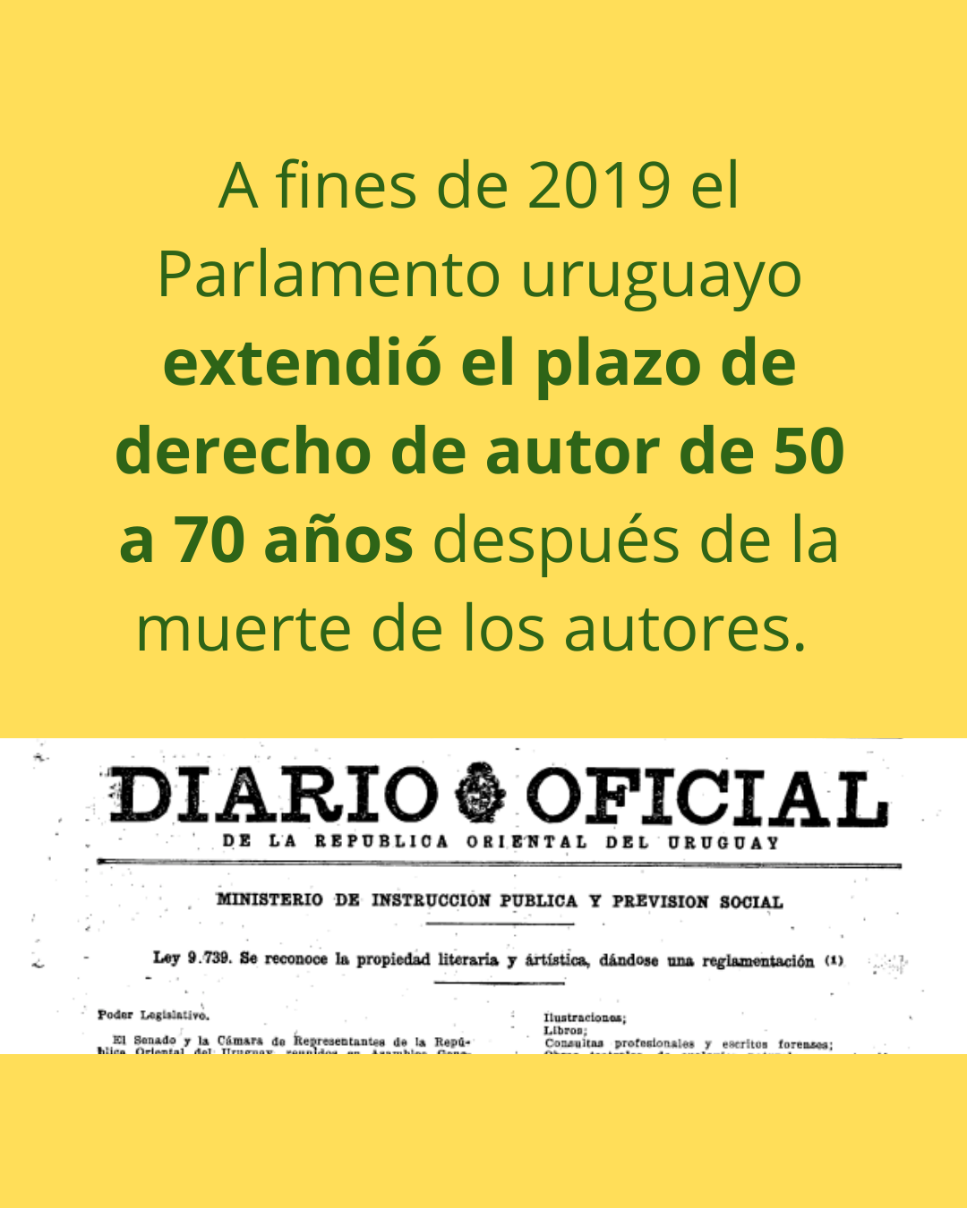 A fines de 2019 el Parlamento uruguayo extendió el plazo de derecho de autor de 50 a 70 años después de la muerte de los autores. Esta ley incluyó además una disposición que devuelve retroactivamente a dominio privado las obras, interpretaciones, fonogramas y emisiones de radiodifusión que ingresaron en dominio público en los últimos 20 años.