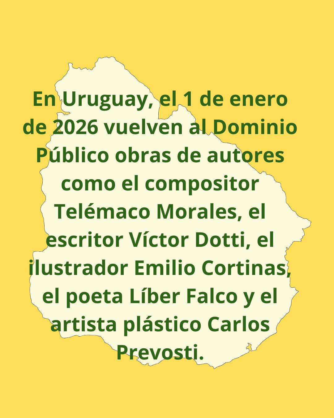 En Uruguay, el 1 de enero de 2026 vuelven al dominio público, entre otras, obras de autores como el compositor Telémaco Morales, el escritor Víctor Dotti, el dibujante Emilio Cortinas, el poeta Líber Falco y el artista plástico Carlos Prevosti.