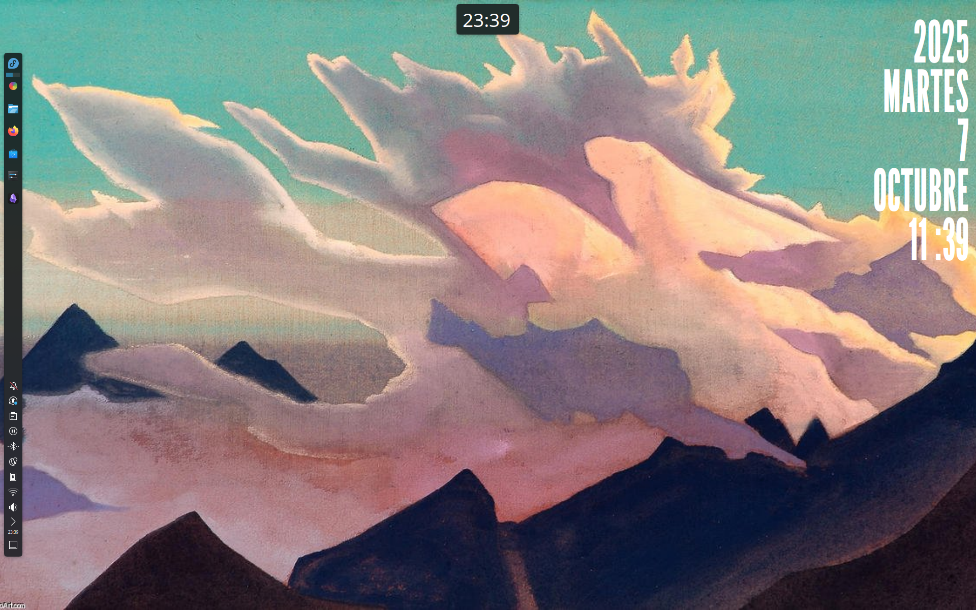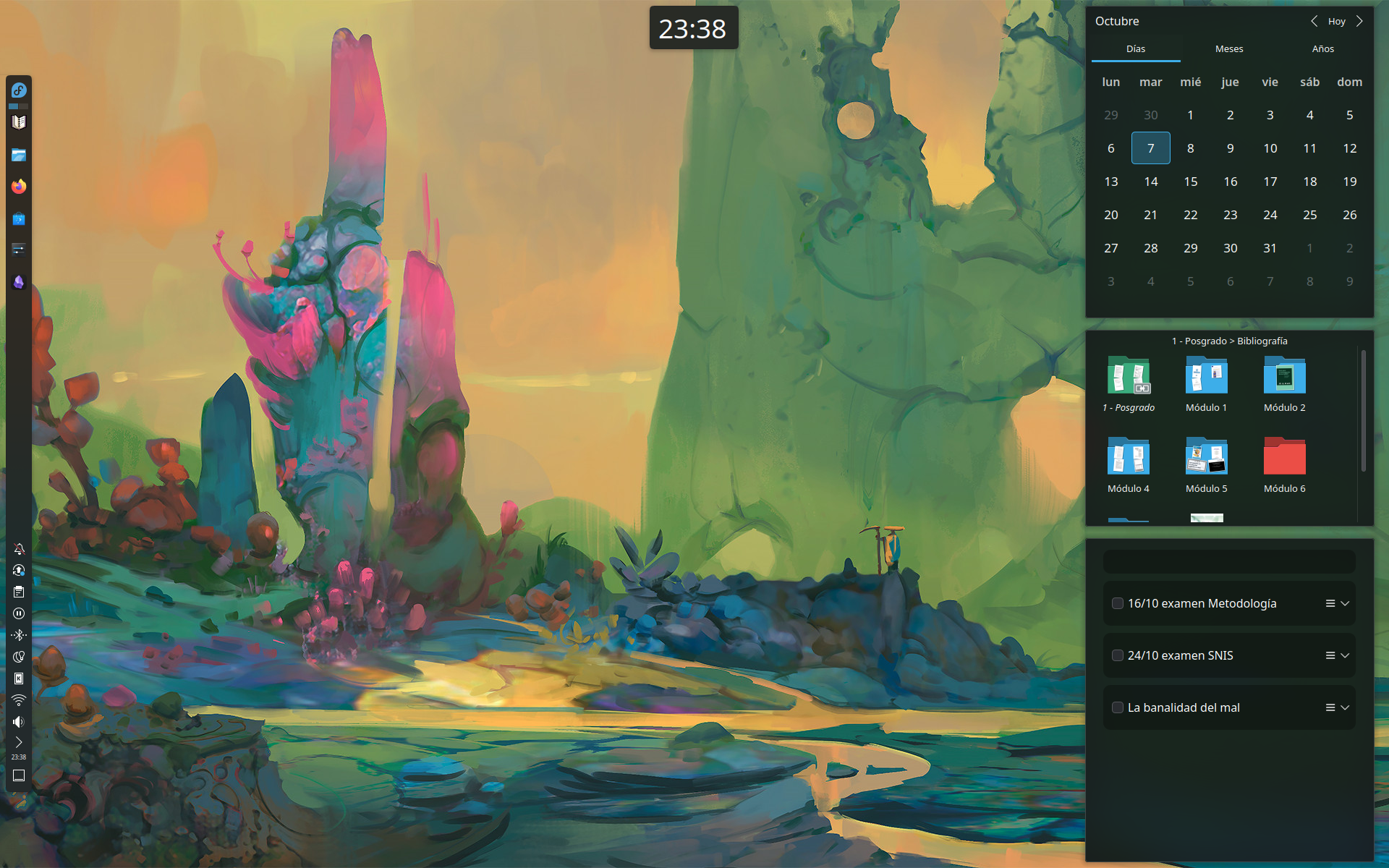 En la primer foto se ve la actividad que tengo destinada a Estudio, y en la segunda la actividad para las cosas cotidianas. Tanto el reloj de arriba como el panel del costado están hechos para que se oculten automáticamente. Así que en realidad es bastante más limpio de lo que se ve ahí. Funfact: el panel del reloj está hecho para que pueda superponerse sobre las barras de aplicaciones en pantalla completa, así que cuando querés saber la hora y tenés algo maximizado, solo hay que mover el mouse al medio y arriba (sí, todavía uso mouse, no, no uso un tiling window manager, no, tampoco uso Arch. Bite me)